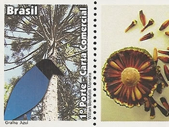 No modelo Gralha-azul (Cyanocorax caeruleus) , no formato vertical, o desenho estilizado da ave é apresentado sobreposto a uma fotografia da Araucária.